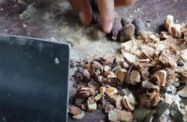 4.再準備10g的川貝,直接用刀將川貝壓碎一些,再準備兩個羅漢果,直接用手捏碎,準備20g的胖大海, 將胖大海也拍碎備用。