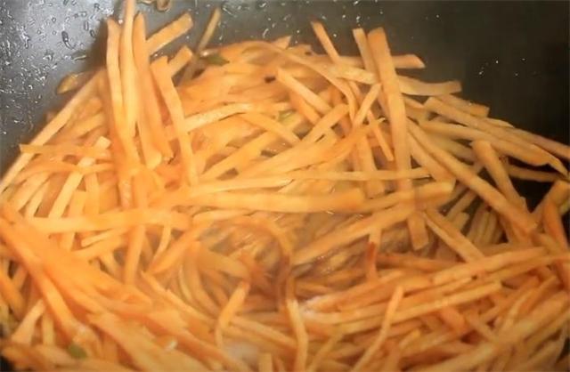 3.起鍋燒油下入蔥花,蔥花炒香后下入紅薯絲,翻炒片刻后加入兩勺香醋,再加兩勺白糖,再加點食鹽,加少許生抽,稍微翻炒下就出鍋,這樣紅薯絲吃著才爽脆。