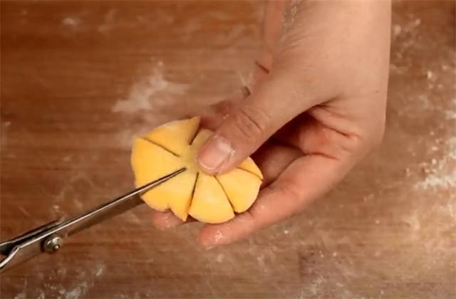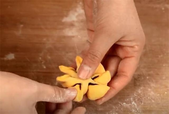 5.把小劑子往下按壓下,搟薄后包上豆沙餡,像包包子一樣包起來(lái)捏緊,用剪刀等距離剪幾刀。