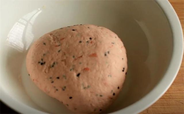 2.加少許食鹽和一勺白糖,再加一勺黑芝麻攪勻,加適量面粉和清水,用筷子攪勻后和成面團。