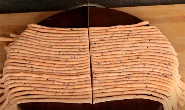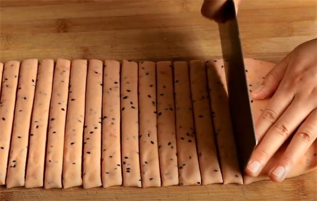 4.揉成長條后搟薄,用刀切開。