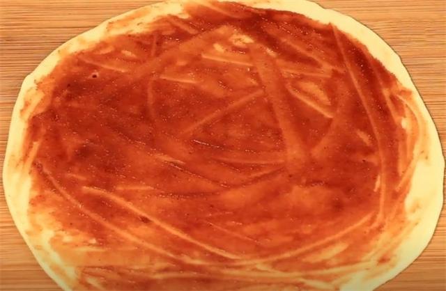 5.把小劑子再揉下用搟面杖搟薄,小劑子搟薄后上面抹一層豆沙餡,上面再摞一張面皮抹上豆沙餡。