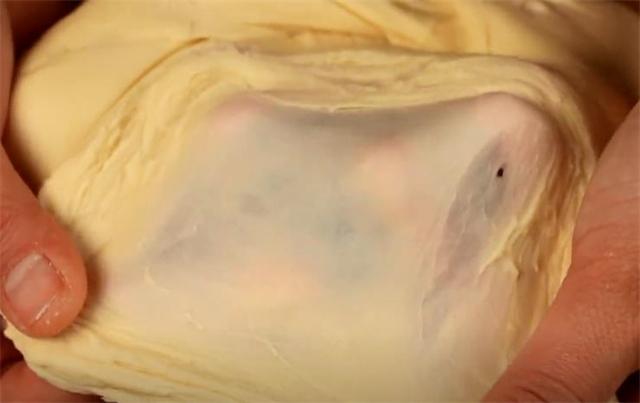 2.揉成面團后再放案板上繼續揉,像搓衣服一樣揉10分鐘左右,揉成這樣能形成薄膜狀。