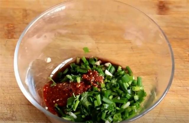 1.先往碗里加入蒜末,加入香菜和蔥花,加適量食鹽,再加入2勺香醋,半勺生抽,少許花椒油,再加點辣椒油。