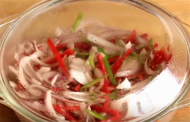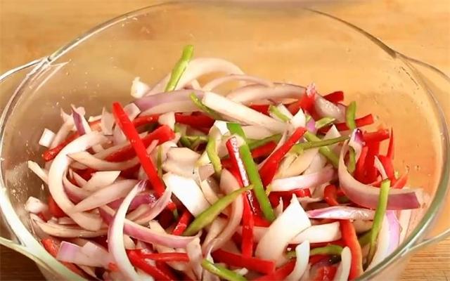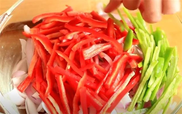 2.一個(gè)紅辣椒切絲,再切點(diǎn)青辣椒絲,和洋蔥放在一起。