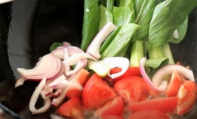 2.起鍋燒油,然后下入西紅柿、青菜和洋蔥炒勻。