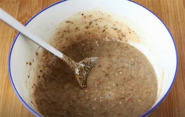 4.接下來做個油酥,往碗里加入兩勺面粉,加入一勺鹽,加一勺五香粉,然后潑入熱好的油進去攪拌均勻,攪成稍微稀一些的狀態(tài),再往碗里加入炒好的小茴香進去,用勺子攪拌均勻,這個油酥就做好了,放一旁備用。