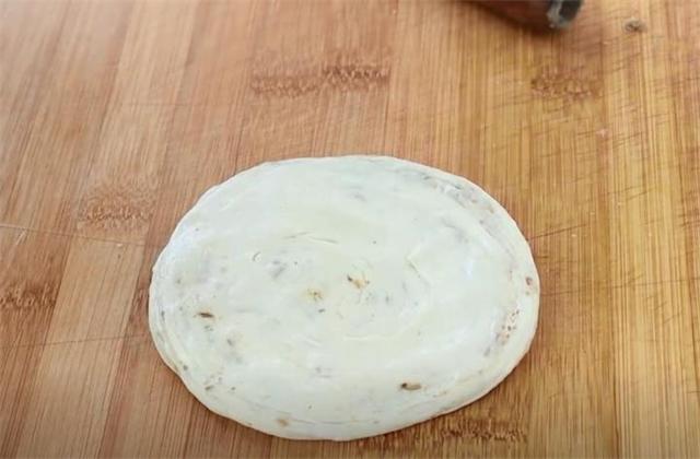 7.卷好后立起來,用手壓扁一些,再搟成圓餅狀,這樣一個一個餅胚就完成了。
