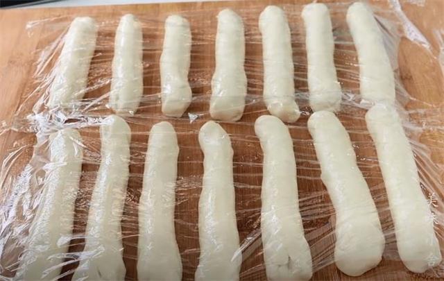 5.做這個油酥餅,用的是半發(fā)面,往大案板上面刷層油防粘,然后把面團倒在案板上面,再繼續(xù)把面團揉均勻揉光滑,一直把面團揉光滑后,再把面團揉成一個粗細均勻的長條狀,然后用手揪成一些大小相同的面劑子,再挨個把小劑子揉成細長條狀,整齊地擺放在一旁,全部揉好后,用保鮮膜包住醒10分鐘。