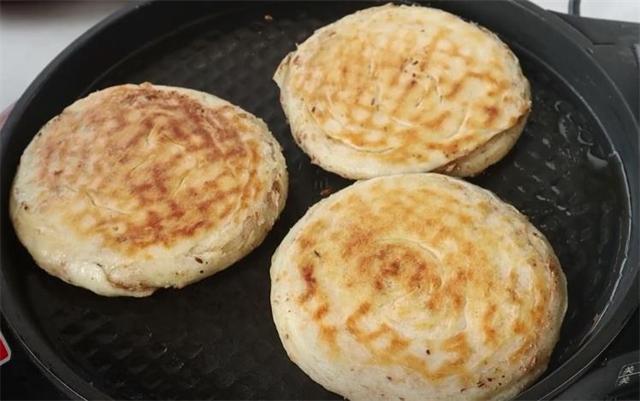 8.接下來往電餅鐺里刷一層油,油熱后,挨個把餅胚放在電餅鐺上面,在餅胚上面也刷層油,蓋上蓋子烙,烙的時候要勤翻面,每隔一分鐘翻過來一次,一直把餅烙熟,烙至兩面金黃的時候就可以了。