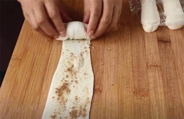 6.10分鐘后,把面劑子拿出來,再用手把面劑子壓扁一些,然后用搟面杖搟得稍微寬一些,盡量搟薄一些,再用手把兩頭稍微抻長一些,上面均勻地刷上剛才做好的油酥,然后從頭卷到尾,這樣做的油酥餅層次比較多。