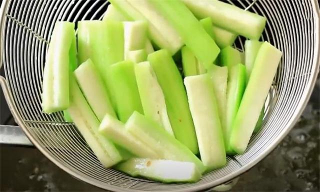 5.油溫六成熱下鍋炸絲瓜,稍微炸下就可以,炸至變色即可撈出。