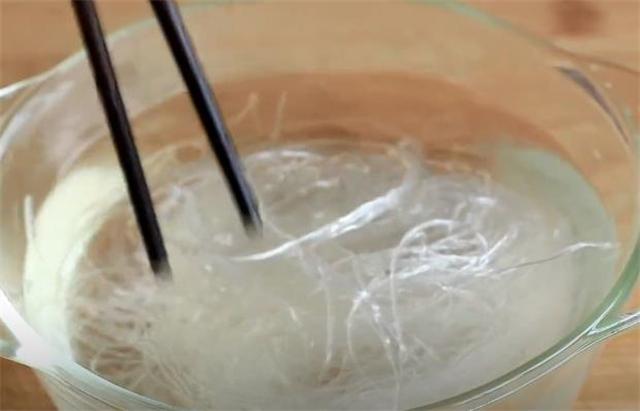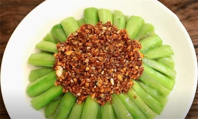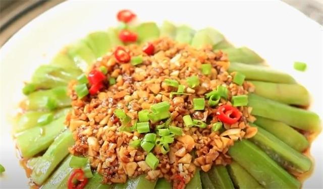 7.絲瓜里加少許食鹽攪拌均勻,粉絲燙好后裝盤,然后擺上絲瓜,澆上蒜蓉料汁。