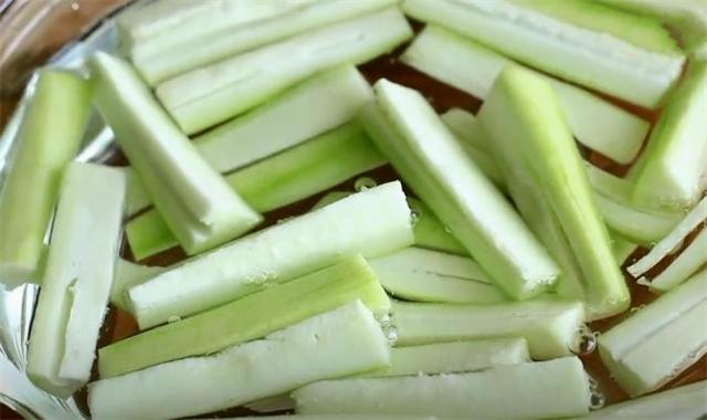 1.絲瓜削皮,分段后切成長條,泡在清水里待用。