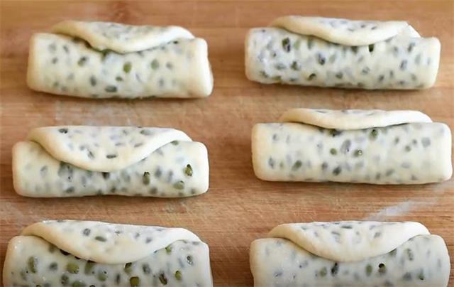 3.案板上撒些干面粉,醒好的面團揉長切成小劑子,然后揉圓壓扁,搟薄后包上綠豆。