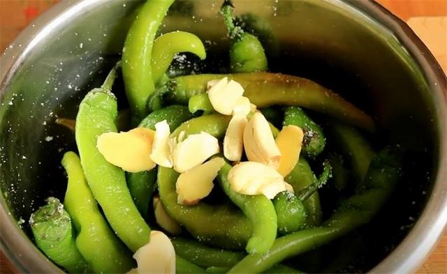 4.辣椒里加2勺食鹽,用手抓勻,再放點姜片和大蒜。