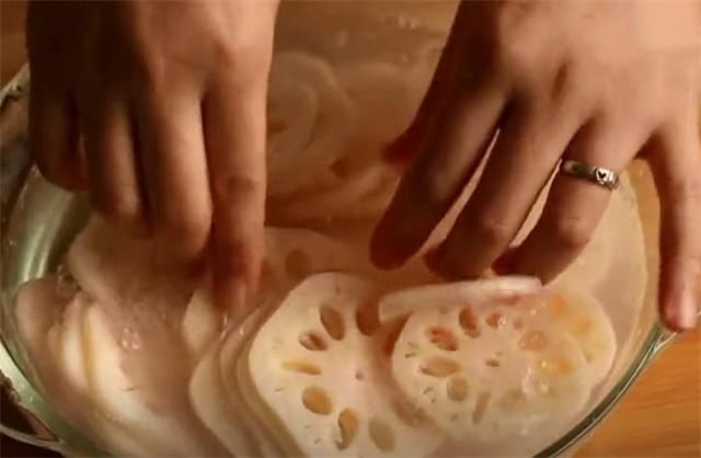 2.清水里加點白醋,把切好的藕片放進去泡5分鐘,這樣可以防止蓮藕氧化變黑。