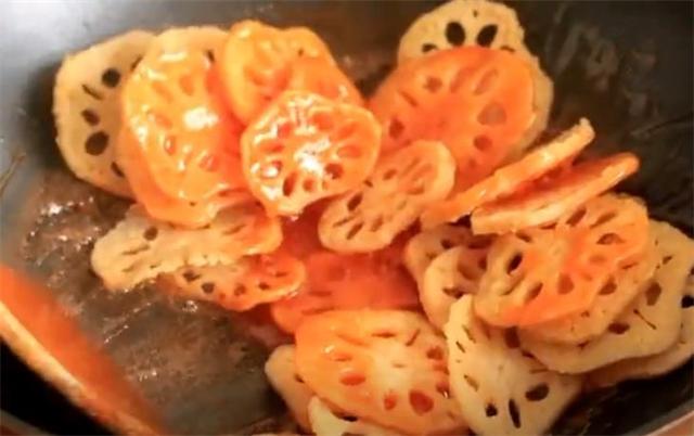 7.鍋里加白糖熬化開,下點番茄醬和白醋,再加點水淀粉,煮沸后下入藕片拌勻。