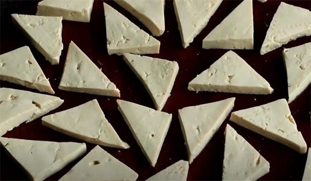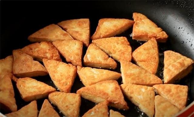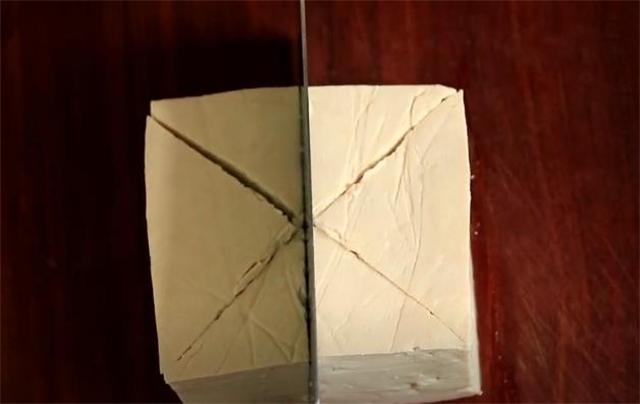 1.先把豆腐切塊,切成這樣的三角形就可以了。