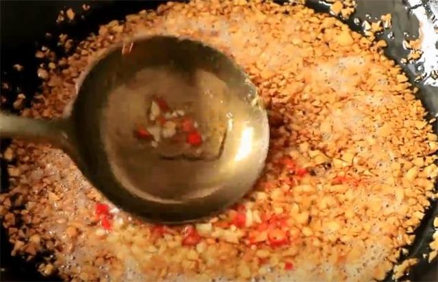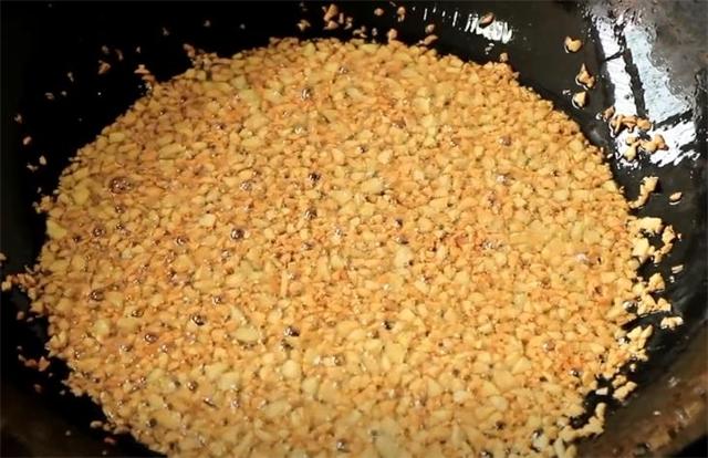 4.起鍋燒油,油燒至三成熱下入多的那份蒜蓉,熬煮蒜蓉的時候要用小火,不停地攪動,以免糊鍋,蒜蓉熬成金黃色的時候關火。