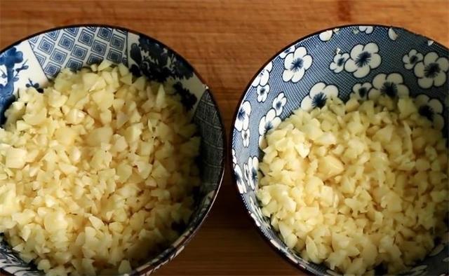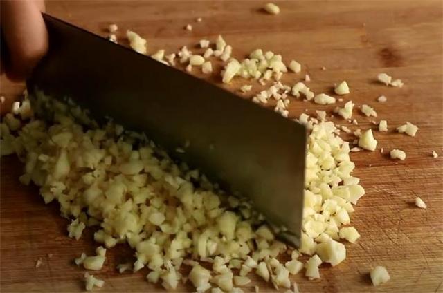 1.先把大蒜剁成蒜蓉,大蒜不能用刀拍,刀拍比較出味,是炒菜用的,蒜蓉是做蒜香的,要用刀剁碎。