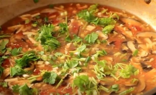 4.起鍋燒油下入西紅柿,西紅柿炒出汁后加水,倒入香菇、木耳和胡蘿卜,再倒入嫩豆腐,煮3分鐘后加食鹽,再加一勺生抽和適量白胡椒粉,加水淀粉勾芡,然后關火,加點香醋和香油,再撒點蔥花和香菜,攪拌均勻,美味即成。