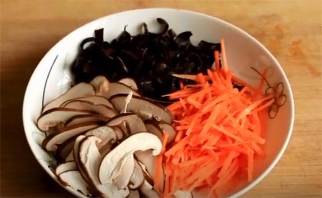 1.洗凈的香菇切成小薄片,提前泡發的木耳切碎,少許胡蘿卜切絲。