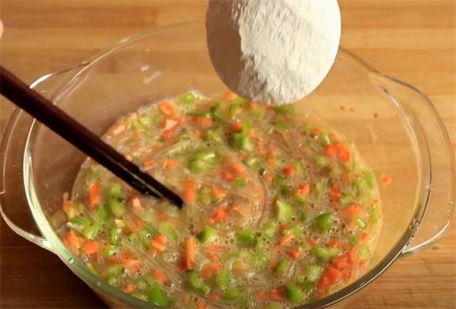 4.加入辣椒和胡蘿卜,加入食鹽和胡椒粉,再加一勺面粉和少量清水攪拌成糊狀。