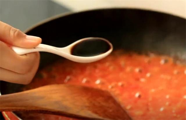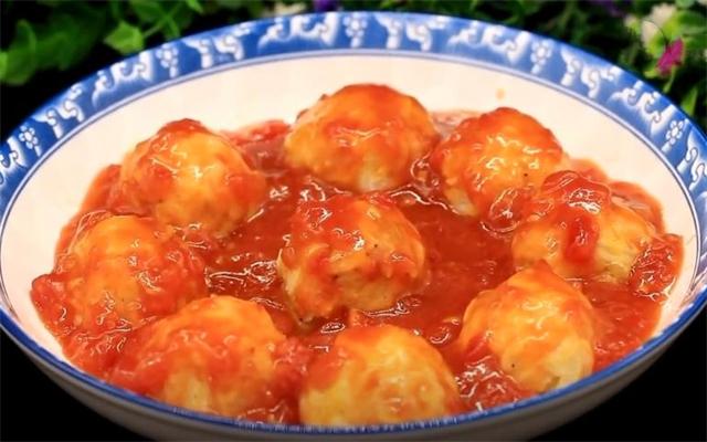 9.稍微翻炒下把西紅柿汁澆到丸子上。