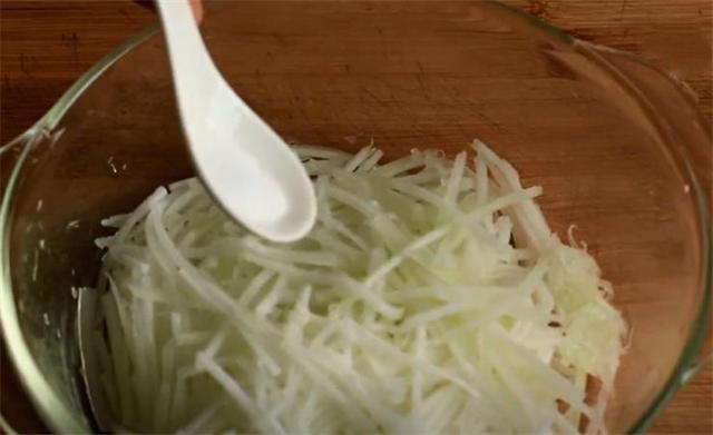 1.把冬瓜去皮,然后擦成細(xì)絲,加點(diǎn)食鹽抓勻后腌制5分鐘。