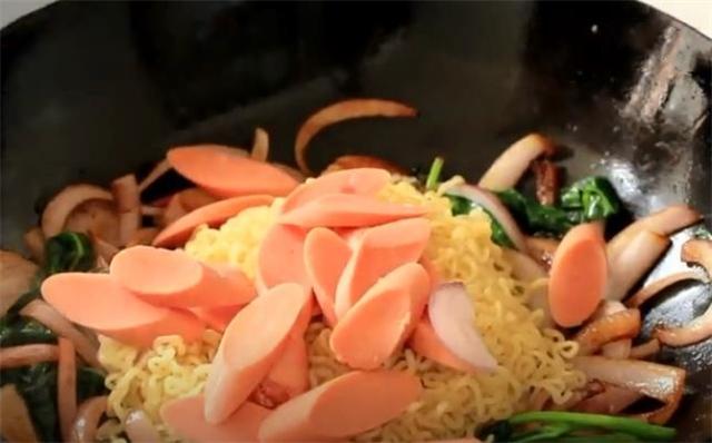 3.倒入方便面和素火腿腸,稍微翻炒下裝盤,美味即成。