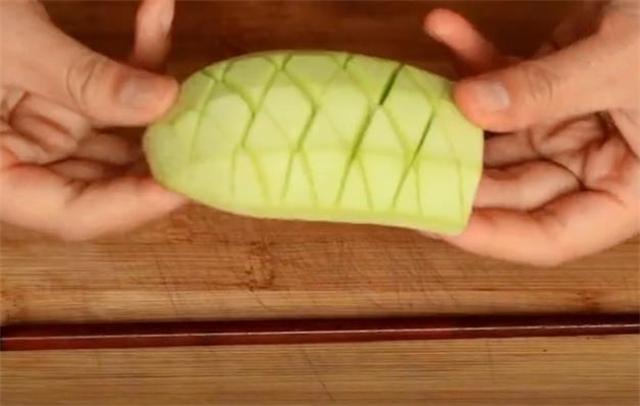 1.先把4根茄子去蒂后削皮,一根茄子一分為四,一雙筷子夾住兩邊,斜刀切,換個方向再斜刀切,切成這個樣子就可以了。
