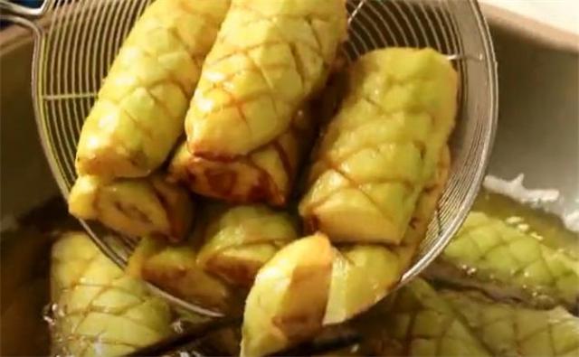 5.油溫七成熱下鍋炸茄子,炸至金黃撈出控油。
