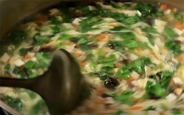 4.鍋內水開后下入豆腐丁,煮沸后用勺子撇去浮沫,然后倒入木耳和胡蘿卜,煮2分鐘,加入水淀粉勾芡,加適量食鹽和白胡椒粉,關火后加一勺香油,最后加入香菜,攪勻即可。