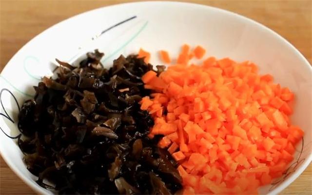 2.提前泡好的木耳切碎,半個胡蘿卜切丁。