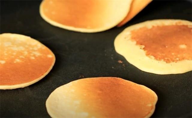 4.電餅鐺加熱后攤成小餅,一面煎熟后翻面,來回翻面煎至熟透。