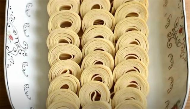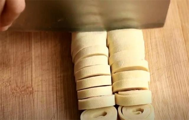 2.兩張豆腐皮疊在一起后卷起來,然后用刀切成段。