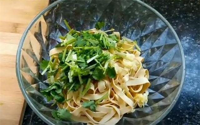 4.用刀把大蒜拍碎,香菜切成小段,和豆腐皮加在一起。(www.ws46.com)