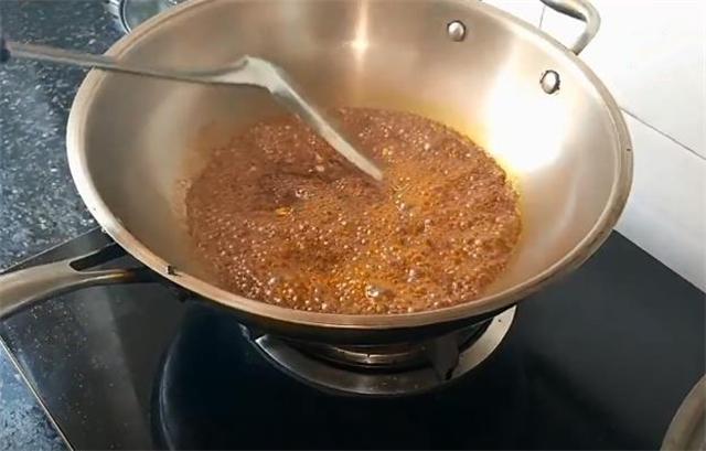 6.熱鍋冷油加一小勺豆瓣醬,加入蒜末炒香,再加入調(diào)好的料汁。