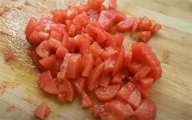 2.西紅柿切十字花刀燙下去皮,切成小塊。