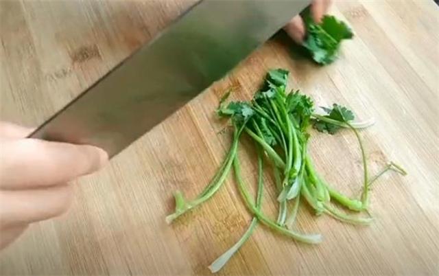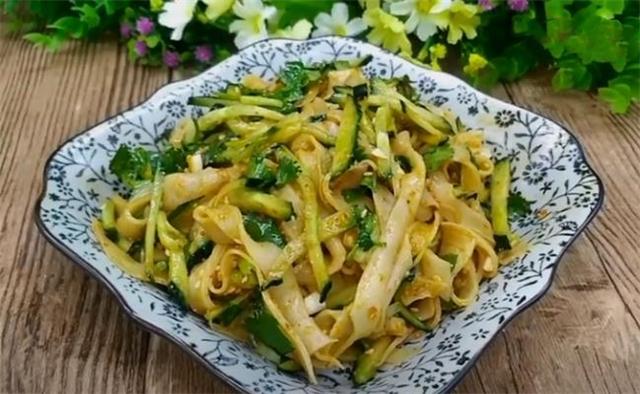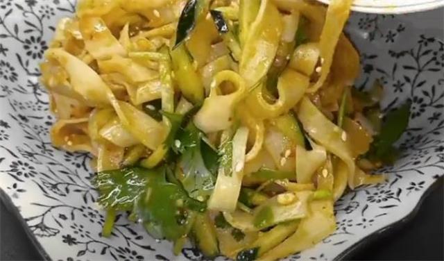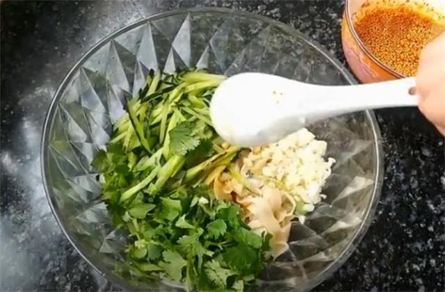 6.切成自己喜歡的寬度放碗里,放入黃瓜絲和香菜、蒜末,一勺生抽和兩勺陳醋,適量食鹽,加點辣椒油。