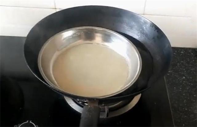 4.平底盤內稍微刷點食用油,面糊倒進去搖晃均勻,鍋內水煮開以后上鍋蒸3分鐘,蒸好后要立刻放進涼水鍋里快速降溫。