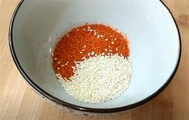 1.碗內(nèi)加入辣椒粉,白芝麻。