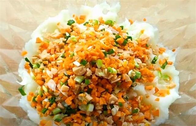 3.土豆蒸熟以后搗碎成泥,把剛才切好的食材倒在土豆泥上。