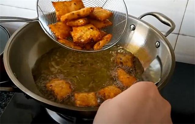 7.鍋內加入適量的食用油,油溫五成熱的時候開始下鍋炸,炸至金黃以后撈出控油。