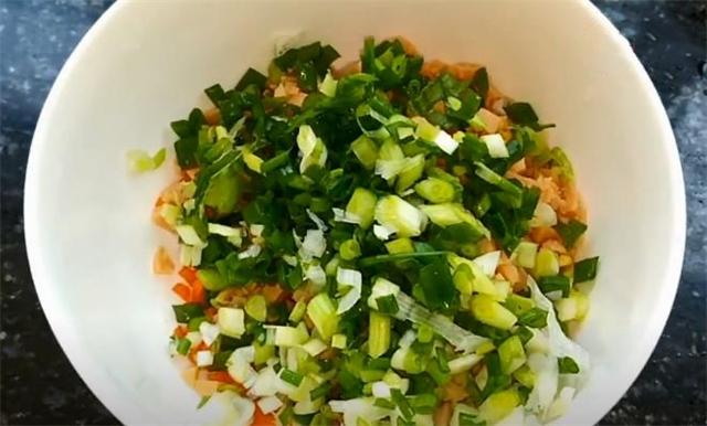 2.少許的胡蘿卜切成小碎丁,兩根玉米素火腿腸切碎,再切一點蔥花。