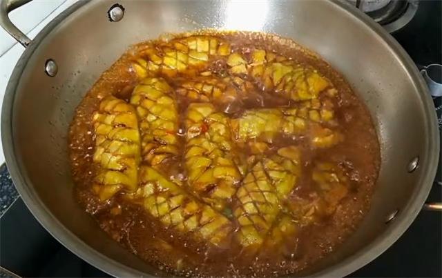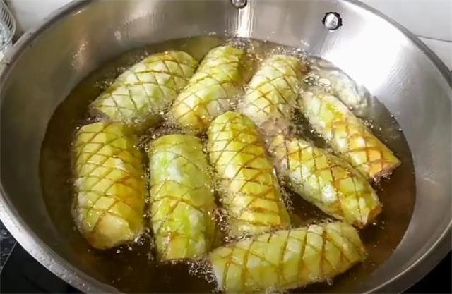 5.鍋內加適量的食用油,油溫大約五成熱的時候茄子下鍋炸,炸至金黃撈出備用。