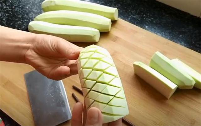 1.準備4個茄子把皮削掉,一個茄子分成4份,用一雙筷子夾住兩邊,順著一個方向斜刀切,再交叉斜刀切,切成這樣就可以了。