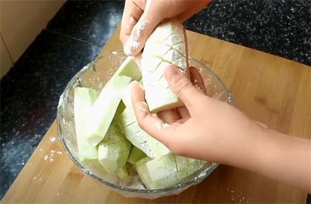 3.把茄子清洗一下,表面均勻地涂抹一層淀粉。