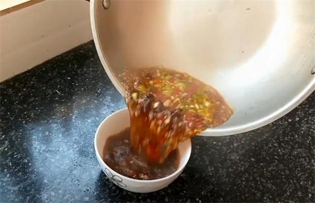 4.熱鍋冷油加入蔥姜蒜和小米椒炒出香味,再倒入料汁,煮開后倒在碗里。